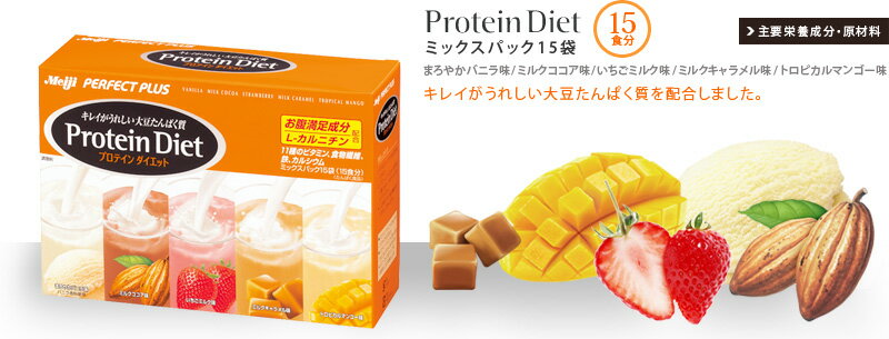 「プロテインダイエット ミックスパック 15袋」は、は、牛乳と混ぜて食事代わりに美味しく飲める、プロテインです。アルギン酸ナトリウム+カルシウム、L-カルニチン、大豆たんぱく質、11種のビタミンや3種のミネラル、食物繊維などを配合。カロリーコントロールだけではない、充実のうれしい成分をプラスしました。ミルクココア味、まろやかバニラ味、いちごミルク味、あじわい抹茶味、トロピカルマンゴー味の、おいしさにこだわった5つのフレーバー。ミックスパック15袋入り。■Meijiだからオイシイ!ダイエットの基本は続けること。でもおいしくなければ長続きしません。だから明治は「おいしさ」に徹底的にこだわりました。お菓子のメーカーだから、おいしさ作りには自信があります。うまれかわったプロテインダイエットのおいしさ、是非、体感してください。■牛乳を使うから、よりオイシイ!ココア、カフェオレ、プリン、ホットケーキ…牛乳のまろやかさとコク、ほのかな甘みを加えることで、おいしくなるものはたくさんあります。そこで明治は、牛乳を上手に使って、ダイエット飲料までおいしくしました。■明治製菓だけの技術です。プロテインダイエットには明治だけの特許の技術が入っています。昆布などのネバネバ成分「アルギニン酸ナトリウム」と「カルシウム」。飲むときはサラサラなのに、この二つが混じって一定の条件になると、プルプルのゼリー状に。食後の満足感もバッチリ!■他にもお腹満足のための工夫がイロイロ特許成分に加えて、プロテインダイエットは食物繊維の働きや、牛乳と混ぜることにより、満足感がしっかり持続。もう一つの工夫が糖質。人は血中糖分が低下することで空腹感を感じます。これが続くとイライラ&ドカ食い、そしてリバウンドなんてことも…だから、プロテインダイエットは適度な甘さで空腹感を緩和。ツラいダイエットよ、さようなら?!主要栄養成分表(1食(25g)当たり) / ミルクココア味 まろやかバニラ味 いちごミルク味 ミルクキャラメル トロピカルマンゴー味 エネルギー 92kcal 91kcal 92kcal 93kcal 92kcal たんぱく質 10.9g 10.0g 10.5g 10.2g 10.0g 脂質 0.83g 0.63g 0.70g 0.80g 0.50g 炭水化物 10.2g 11.3 11,0 11.2 11.7g